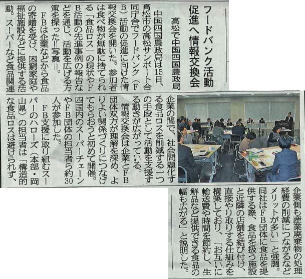 2019年2月15日に香川会場、および2月21日に岡山会場で農林水産省 中国四国農政局主催の平成30年度フードバンク活動の促進に向けた情報交換会が開催されました。
