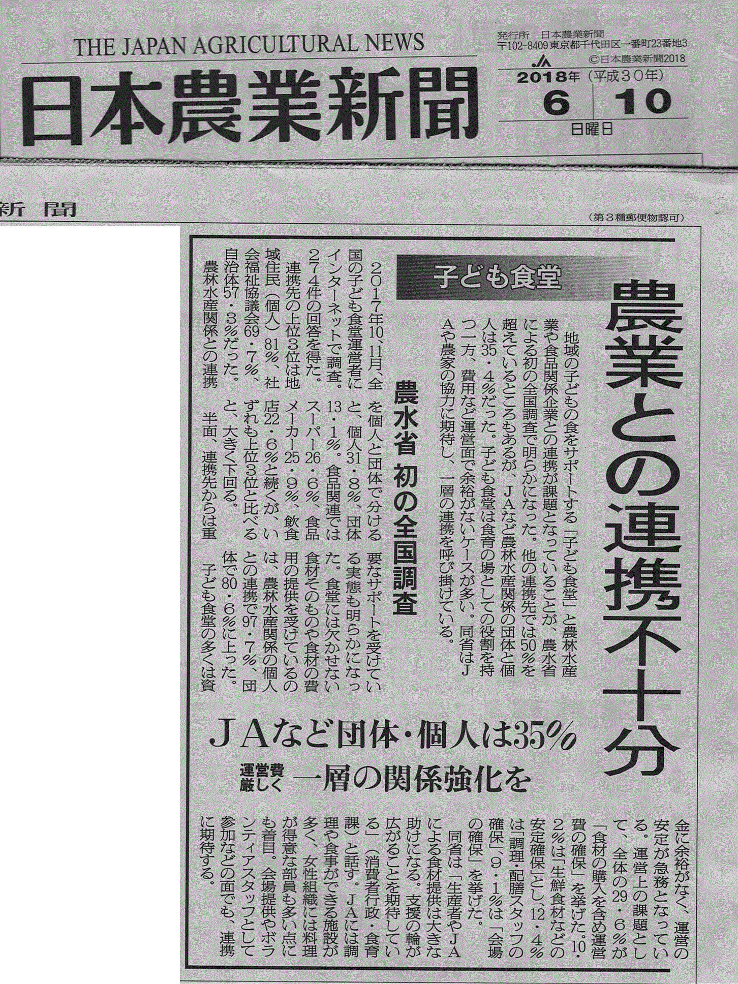2018.6.10 日本農業新聞 子ども食堂記事