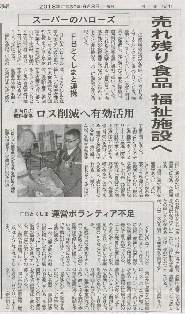 2018年9月8日付け徳島新聞に、JFL加盟スーパーの(株)ハローズ(本部:岡山県早島町)から食品を提供頂いたJFL加盟フードバンク NPO法人 フードバンクとくしま様(本部:徳島県徳島市)のフードバンクへの取り組みが掲載されました。