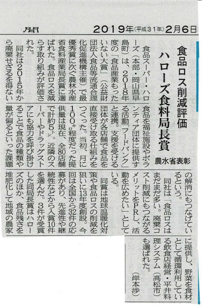 2019年2月6日付山陽新聞 地方経済面に、JFL加盟スーパーの(株)ハローズ様(本部:岡山県早島町)が第6回食品産業もったいない大賞 農水省食料産業局長賞を受賞された記事が掲載されました。